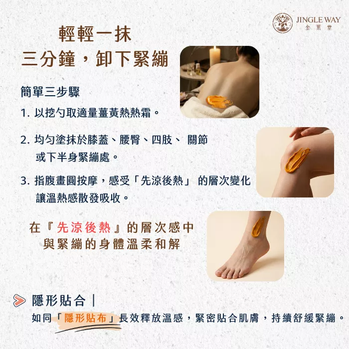 業界首創先涼後熱配方,溫熱深層滲透,迅速紓緩筋骨不適、久站久坐與家務勞累,提供持久舒適體驗。